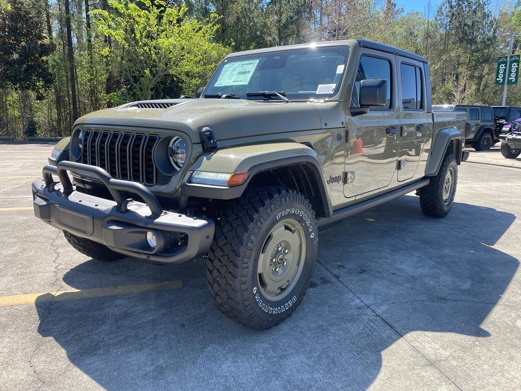 Quick Order Package 24T Willys 41: LED Taillamps; Protection Sill Rails; Willys '41 Retro Edition Gladiator Decal; MOPAR Black Hood Graphic; 4WD Willys '41 Tailgate Decal; MOPAR All-Weather Slush Mats; Willys '41; LT255/75R17C OWL On/Off Road Tires; Body Color Fender Flares (2-Piece); Front Heavy Duty Red Accent Shock Absorbers; Daytime Running Lamps LED Accents; Front LED Fog Lamps; LED Premium Reflector Headlamps; E-Locker Rear Axle; Green Soul Cloth Wrapped Mid-Bolster; Corning Gorilla Glass; Trailer Hitch Zoom; Class IV Receiver Hitch; Security Alarm; Performance Hood; Steel Front Bumper; 17" X 7.5" Fully Painted Wheels; Advanced Brake Assist; Willys Suspension; Heavy Duty Engine Cooling; Automatic Headlamps; Air Conditioning W/Auto Temp Control; 5. 950 lbs GVWR; Deep Tint Sunscreen Windows; MOPAR Triple Hoop Grille Guard; Off-Road Plus Mode; Central ADAS Decision Module (CADM); Willys '41 US Edition U.S. Hood Decal; Full Speed Forward Collision Warning Plus; Rear Heavy Duty Red Accent Shock Absorbers; Front Door Locks 2-Door Passive Entry; 97 MPH Vehicle Max Speed Calibration; Cloth Low-Back Bucket Seats; Cluster 7.0" TFT Color Display; Power Heated Mirrors; Daytime Running Lamp System; Auxiliary Switches; Premium Wrapped Steering Wheel; Sun Visors W/Illuminated Vanity Mirrors. Black 3-Piece Hard Top. Alpine Premium Audio System. 41. MyFlexCare Service Plan. **Equipment listed is based on original vehicle build and subject to change. Please confirm the accuracy of the included equipment by calling the dealer prior to purchase.**